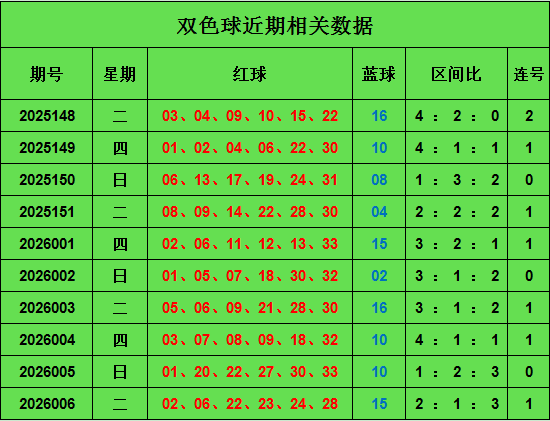 双色球上期开出奖号:02 06 22 23 24 28+15,区间比是2 : 1 : 3,开出连号22 23 24.