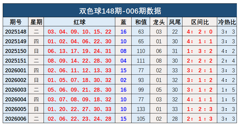 双色球第2026006开奖奖号:红球02、06、22、23、24、28,蓝球15。和值105,龙头02,凤尾28,区间比2:1:3,冷热比3:3。蓝球开出大数号码15。