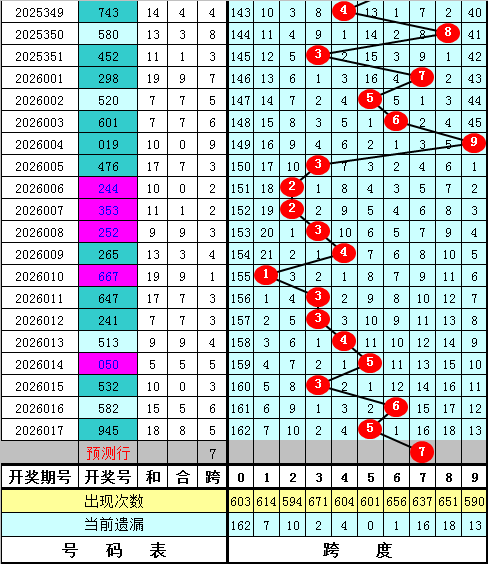福彩3D第2026017期最大跨度开出5,跨度近期分布比较密集,主要分布在3-6区段,本期预计最大跨度在5-9区段开出,最大跨度参考6789,一码跨度参考7。
