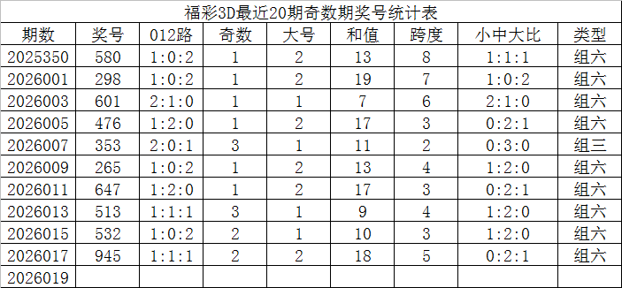 福彩3D最近20期奇数期奖号为: