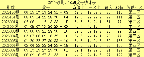 双色球第2026008期开出奖号:06 09 16 27 31 33 + 10。其中红球三区比为2:1:3,和值为122,奇偶比为4:2,跨度为27,蓝球出现在第三区。