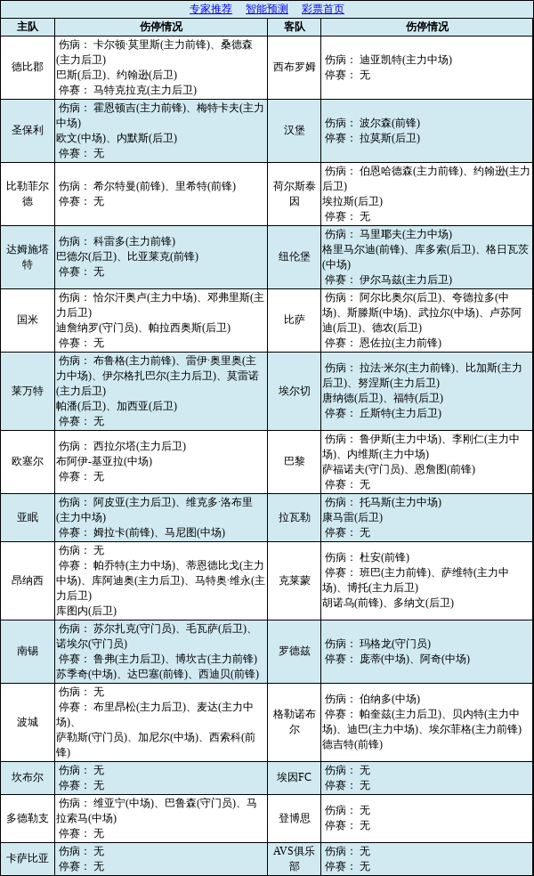 伤停点评:胜负彩第26015期由英冠、德甲、德乙、意甲、西甲、法甲、法乙、荷乙和葡超赛事组成。英冠赛场,德比郡3大主力无法出战;德甲圣保利主力前锋霍恩顿吉以及主力中场梅特卡夫受伤;意甲赛场,比萨主力前锋恩佐拉停赛;西甲方面,莱万特4大主力因伤高挂免战牌;法甲赛场,大巴黎3大主力中场继续受伤缺阵。
