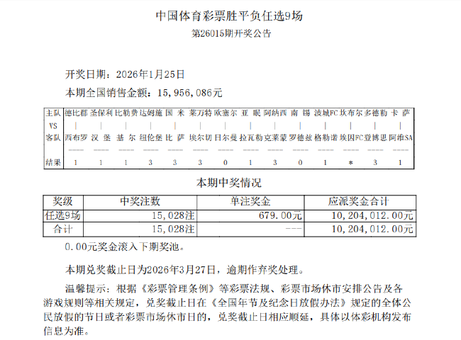 北京时间1月25日,胜负彩第26015期任九开奖结果揭晓,本期任九开出15028注679元。本期任九总投注额为15,956,086元。