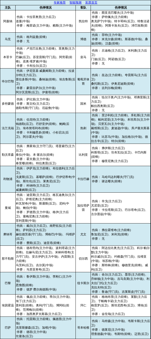 伤停点评:胜负彩第26019期全部由欧冠赛事组成。阿森纳两大主力中场梅里诺和赖斯均累计黄牌停赛;热刺阵容受损严重,多达11人无法登场;曼城主力中场罗德里因上轮染红停赛;纽卡5名主力球员因伤高挂免战牌;巴萨中场德容也因累计黄牌停赛无缘最后一轮比赛。