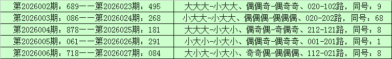 所以,排列三第2025215期奖号:695,与排列三第2026028期奖号可能没有同号。或者排列三第2026028期奖号大小比、奇偶比和012路比可能与第2025215期奖号直选形态:大大大、偶奇奇和002路不全部相同。