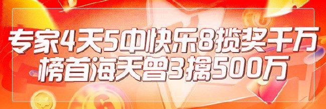 海天:总榜第一!前期中一二等奖累计收获1.04亿元!预测快乐8共6次命中一等奖,其中3次擒选十头奖500万,预测快乐8中奖数、中选十头奖500万次数和奖金排行均位居新浪专家首位!