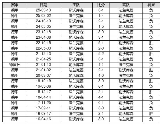 法兰克福 VS 勒沃库森两队近10年的交战次数为21场,法兰克福6胜0平15负,赢球概率为28.6%,平局概率为0.0%,输球概率为71.4%。