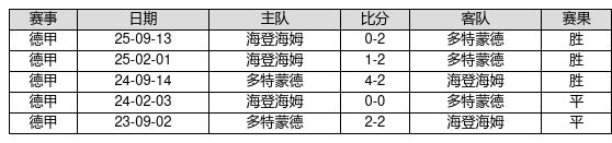 多特蒙德 VS 海登海姆两队近10年的交战次数为5场,多特蒙德3胜2平0负,赢球概率为60.0%,平局概率为40.0%,输球概率为0.0%。