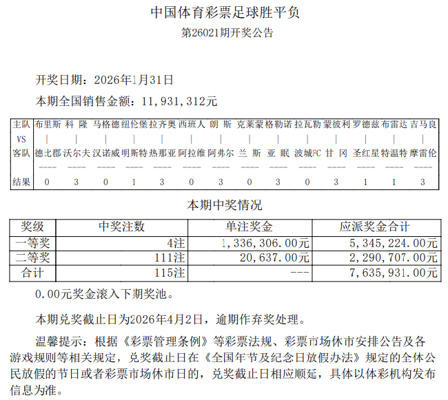 北京时间1月31日,足彩第26021期开奖结果揭晓。本期足彩头奖仅开出4注,单注奖金1,336,306元;二等奖开出111注20,637元;任九开1111注8595元。本期14场销量为11,931,312元,任九投注总额为14,921,736元。