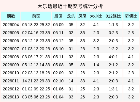 大小比分析:上期前区奖号大小比为2:3,最近10期前区大小比为24:26,小数较热,本期注意小数热出,参考大小比2:3。