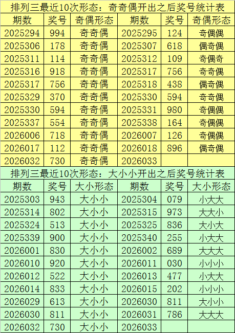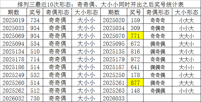 排列三最近10次同时开出奇偶形态:奇奇偶和大小形态:大小小时其奖号分别为:734-934-934-534-510-714-514-532-514-512-730,下期分别开出号码为:159-309-771-672-816-972-641-178-877-148,详细统计见下表: