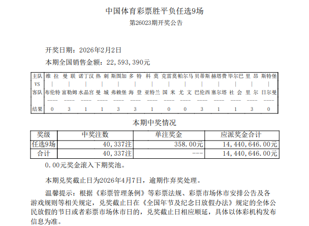北京时间2月2日,足彩第26023期任九开奖结果继续。本期任九开出40,337注,单注奖金358元。本期任九投注总额为22,593,390元。