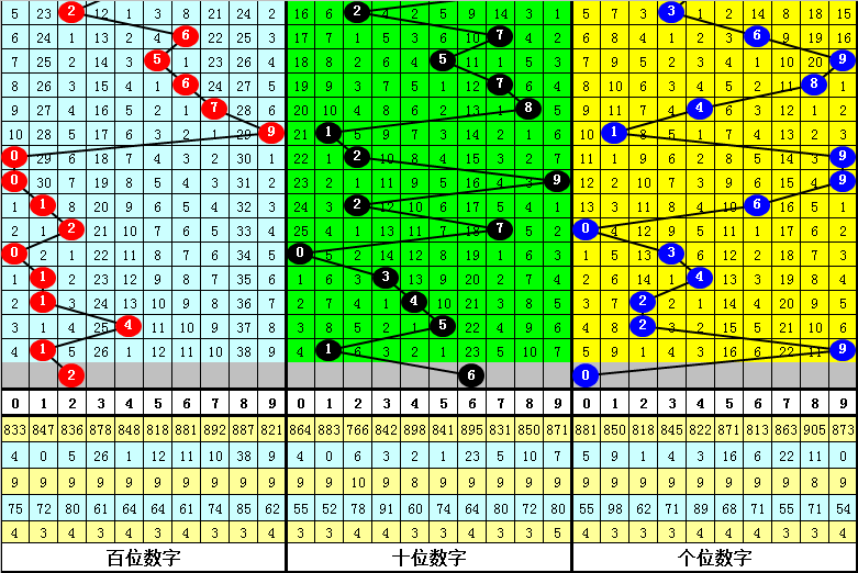 从以上统计可以看出,百个位两码合差0与8同时出现之后其下期两码合差表现最热的4个分别为:0246,本期百个位两码合差可以参考这四码中的数据。