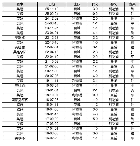 利物浦 VS 曼城两队近10年的交战次数为28场,利物浦12胜9平7负,赢球概率为42.9%,平局概率为32.1%,输球概率为25.0%。