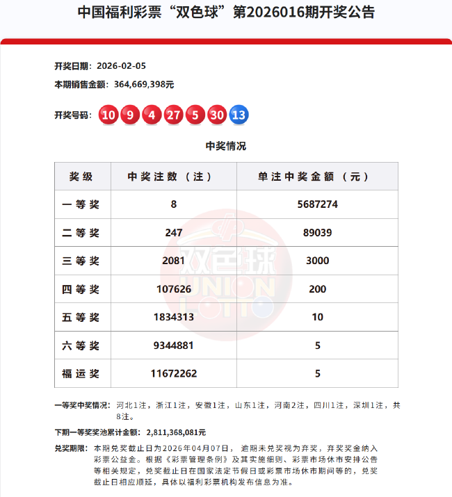 北京时间2026年2月5日,福彩双色球第26016期开奖,当期开奖号码为红球04 05 09 10 27 30,蓝球13。本期一等奖共开出8注,单注奖金568万余元。因开奖前奖池高于15亿,执行特别规定,增设5元福运奖(命中3枚红球即中奖),福运奖开出11672262注。