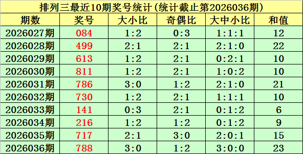 上期回顾:排列三第2026036期奖号为:788。奖号类型:组三,和值:23,奇偶比:1:2,跨度:1,大小比:3:0。