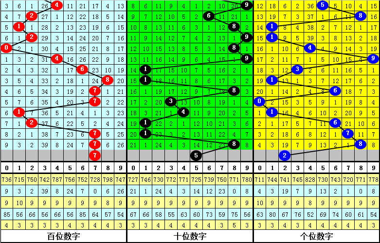百位号码奇偶比为5:3,奇数号码表现相对较热,本期预计奇数号码再出;大小比为7:1,大号走势较热,本期防止大号再次出现。