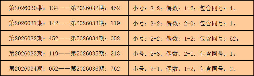 统计3D历史上已开出的奖号发现,在连续5期开奖号码中:3D在第2026030期-第2026034期分别开出奖号:134-142-452-119-052。
