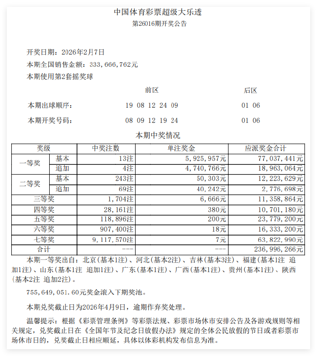 北京时间2月7日晚,体彩大乐透第26016期开奖,当期开奖号码为前区08 09 12 19 24,后区01 06。