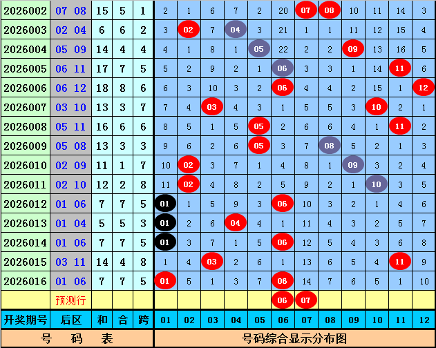 后区分析:上期后区为一奇一偶号码01+06,最近10期后区号码奇偶比为11:9,最近50期后区奇偶比为51:49,本期后区参考一奇一偶组合,关注两码06、07。