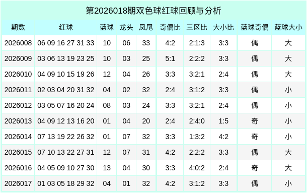 蓝球近十期的奖号中,大数开出5枚占,小数开出5枚;奇数出现3枚,偶数出现7枚,本期关注开出小数+偶数,推荐参考:06。