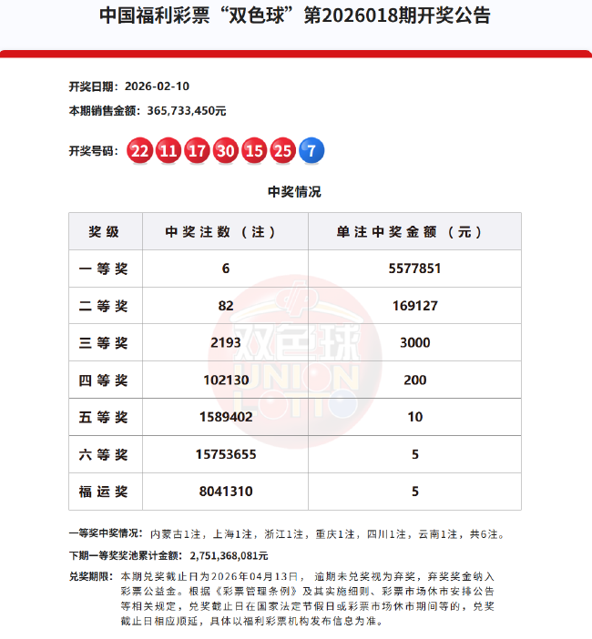北京时间2026年2月10日,福彩双色球第26018期开奖,当期开奖号码为红球11 15 17 22 25 30,蓝球07。本期一等奖共开出6注,单注奖金557万余元。因开奖前奖池高于15亿,执行特别规定,增设5元福运奖(命中3枚红球即中奖),福运奖开出8041310注。