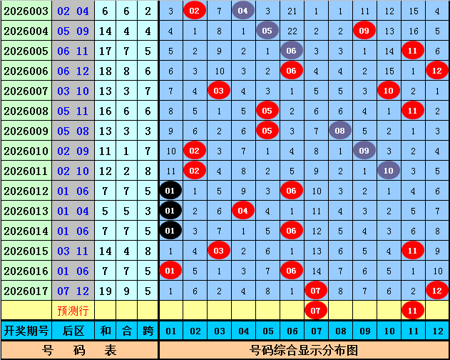后区第二位:上期该位开出号码12,为遗漏10期的冷码,前7期该位分别遗漏:3期、5期、9期、1期、6期、1期、10期,其中冷温热号码个数比为1:3:3,热码出现较少,本期注意该位热码回补,参考热码11。