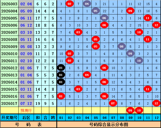 后区分析:后区上期开出号码07和12,分别遗漏14期和10期,目前后区01-12区间冷温热号码个数比为0:6:6,本期后区注意号码09+10。