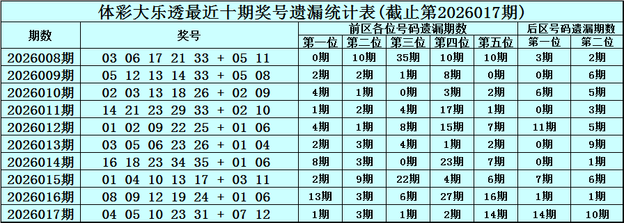 第2026017期奖号:04 05 10 23 31 + 07 12 ,各位号码遗漏期数为:1期、3期、1期、2期、14期 + 14期、10期。