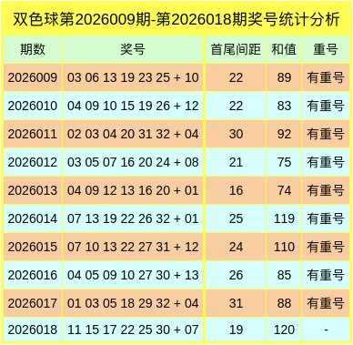 上期红球和值为120,无重号,无连号,首尾间距为19。
