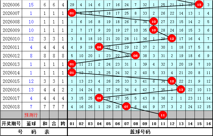 蓝球推荐:蓝球上期开出奖号07,为奇数蓝球,本期预计蓝球继续开出奇数号码,蓝球参考07、09、11、14、15。