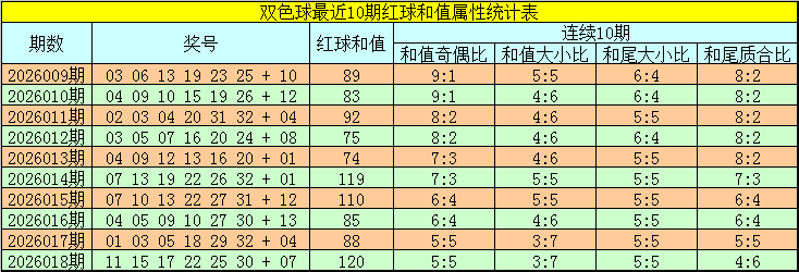 双色球红球最近10期开出和值分别为:89、83、92、75、74、119、110、85、88、120。