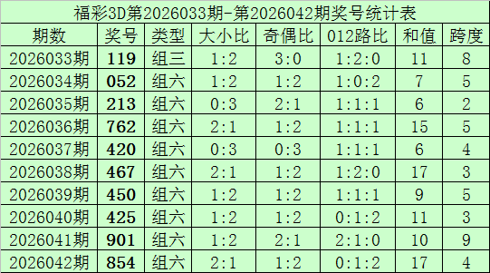 开奖回顾:福彩3D第2026042期奖号为854,其中奖号大小比为2:1,奇偶比为1:2,012路比为0:1:2,和值为17,跨度为4。