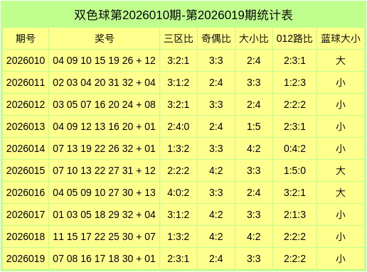 红球大小比为3:3,奇偶比为2:4,012路比为2:2:2,蓝球开出小数。