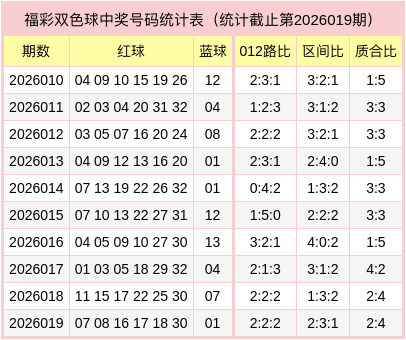 红球三区比2:3:1,质合比为2:4,012路比为2:2:2,蓝球为质数、1路号码。