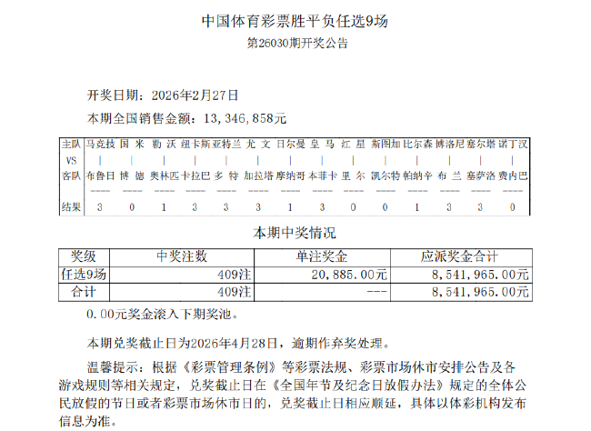 北京时间2月27日,足彩任九第26030期开奖结果揭晓。本期任选九场开出409注,单注奖金20885元。本期任九投注总额为13,346,858元。