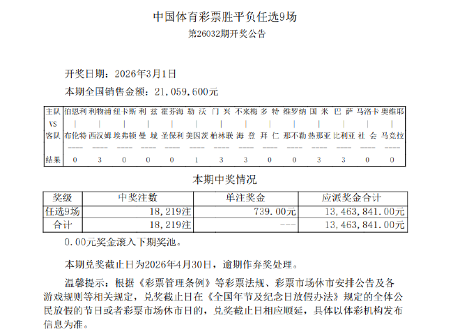 北京时间3月1日,胜负彩第26032期开奖结果揭晓。本期任选九场开出18,219注,单注奖金739元。本期任九投注总额为21,059,600元。