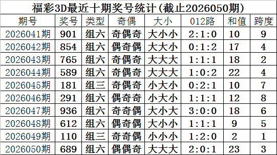 开奖回顾:福彩3D第2026050期奖号为689,奖号形态为:组六、大大大、2:0:1、偶偶奇。