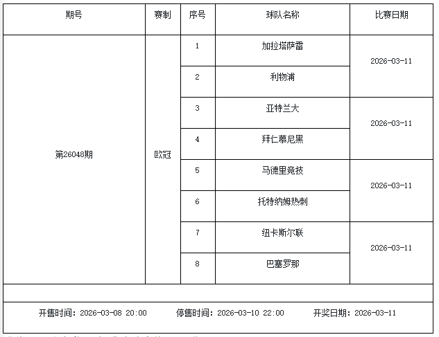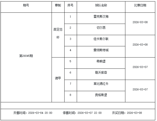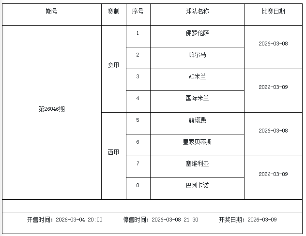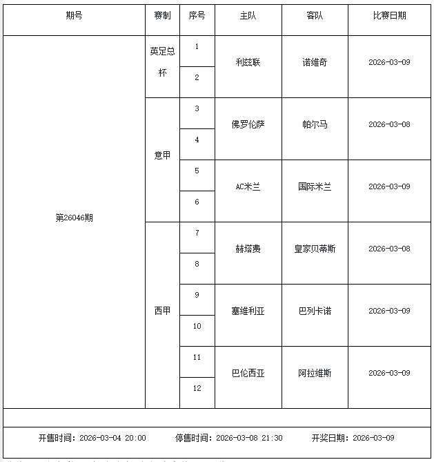 我中心制定了2026年中国足球彩票胜负游戏(14场、任选9场)、6场半全场胜负游戏和4场进球游戏3月6日-3月12日的竞猜场次安排(具体附后),其竞猜对象、开售时间、停售时间和计奖时间均以本文为准。