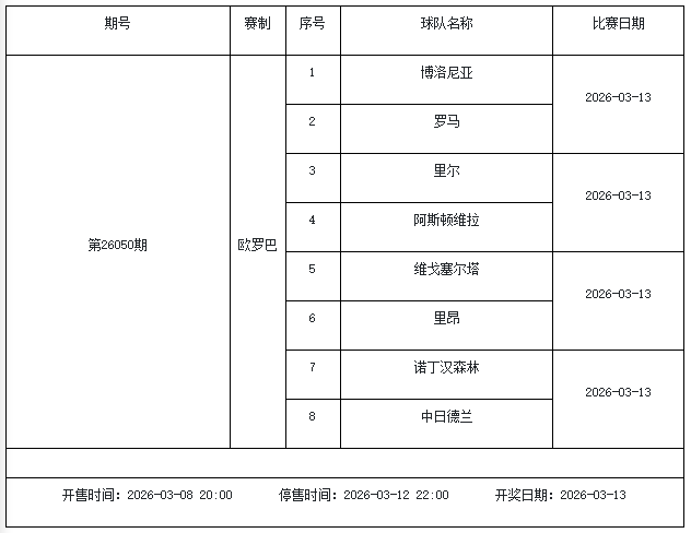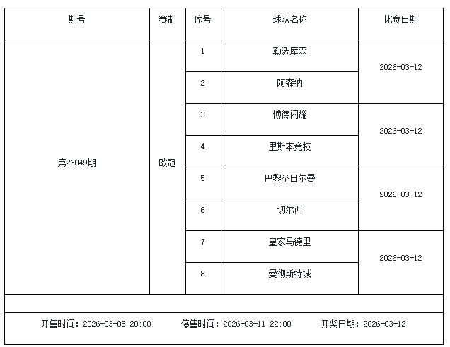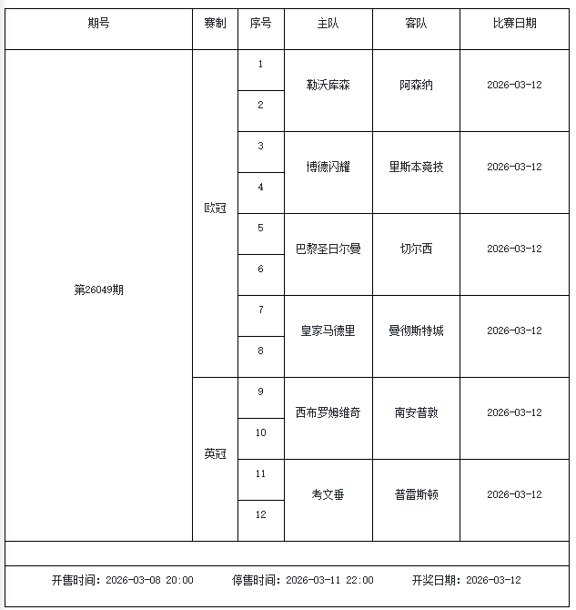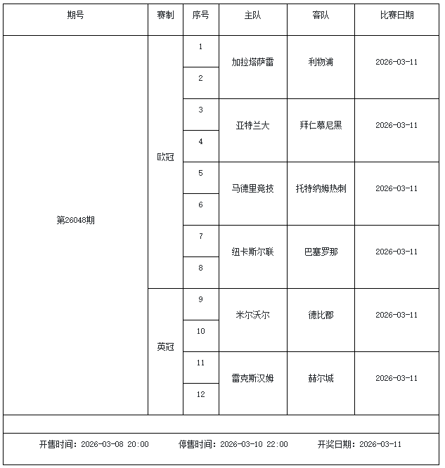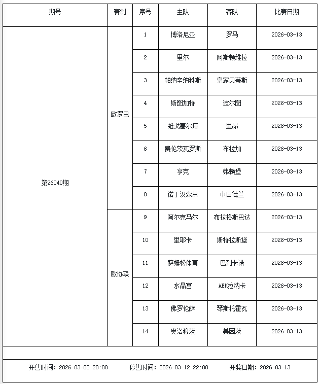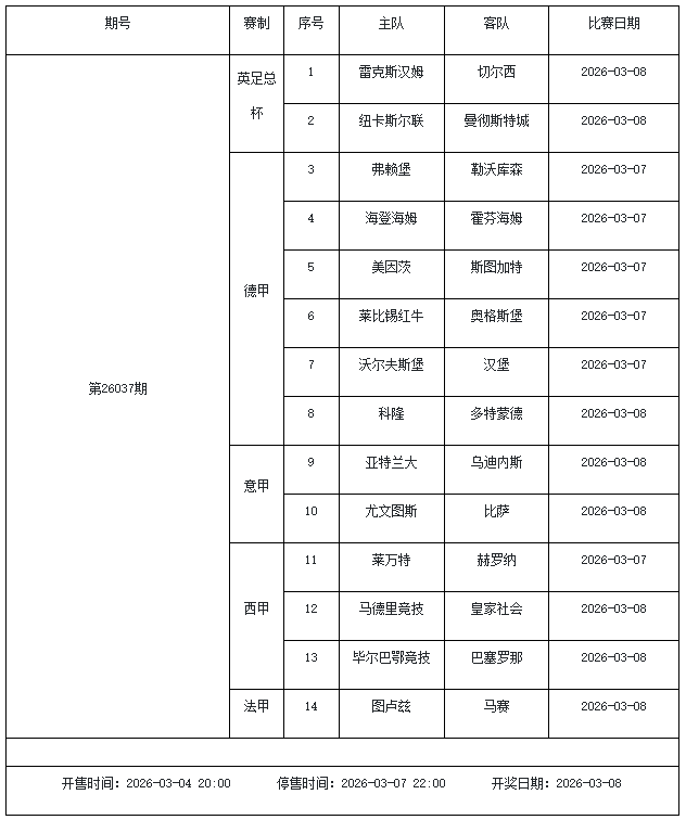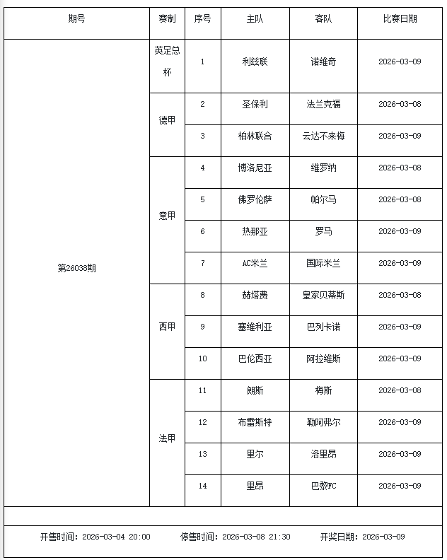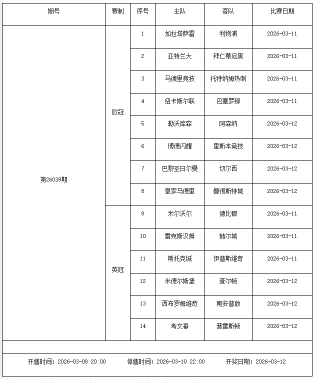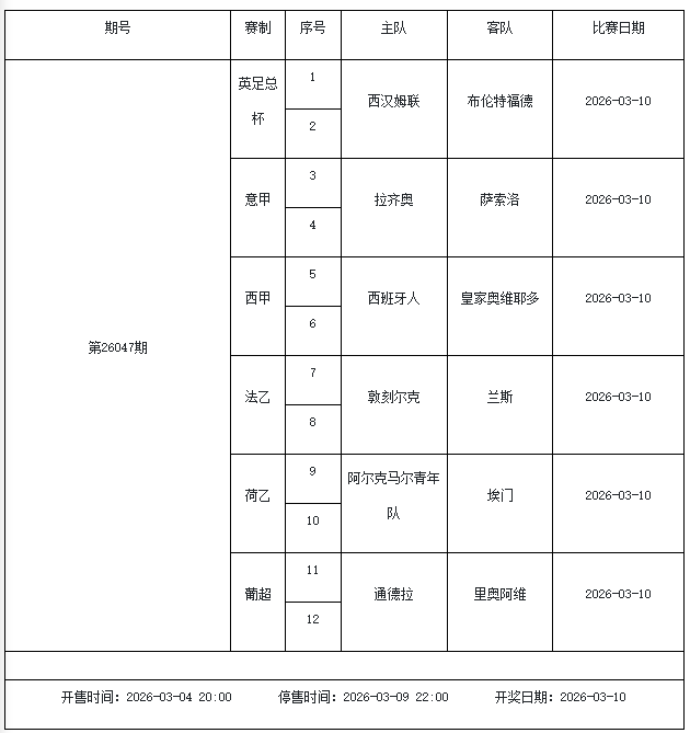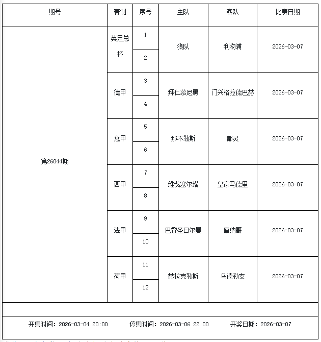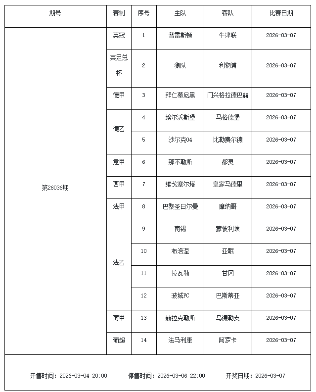北京时间2026年3月3日,国家体彩中心公布了2026年3月6日-3月12日的足彩赛程,3月6日(周五)、3月7日(周六)、3月8日(周日)、3月10日(周二)、3月12日(周四)共5期。其中26036期包含足总杯英冠德甲等10大赛事混猜、第26037期、26038期由英德意西法5国比赛组成、26039期竞猜欧冠英冠、26040期竞彩欧罗巴欧协联。