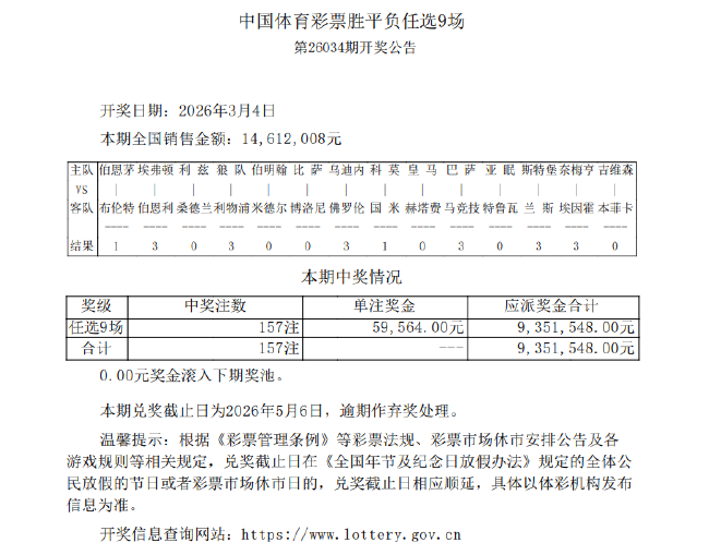 北京时间3月4日,胜负彩第26034期任九开奖结果揭晓。本期任九开出157注,单注奖金59,564元,本期任九投注总额为14,612,008元。