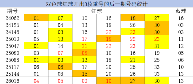 小编统计了近10次双色球开出3枚重号的下一期奖号,总结出以下几个规律,可供彩民在选号时参考。首先是龙头方面,质数龙头热开8次,概率达到80%。其中龙头01开出过6次,占比60%不容忽视!其次是凤尾方面,奇数凤尾近7次开出6次,因此下一期奖号应多留意奇数凤尾。
