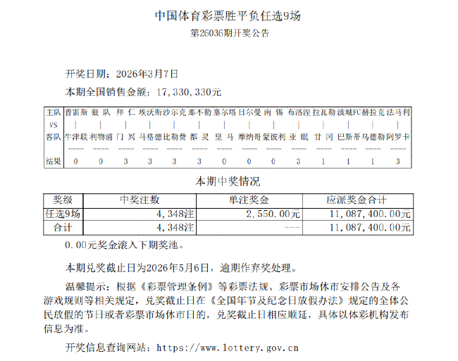 北京时间3月7日,胜负彩第26036期任九开奖结果揭晓。本期任九开出4,348注,单注奖金2,550元,本期任九的销量为17,330,330元。