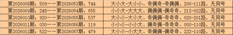 在排列三历史开奖中,第2026008期-第2026012期连续5期奖号为:509-248-920-030-522。