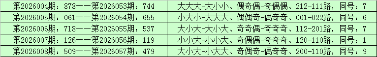 统计排列三已开出的奖号发现,在连续5期(第2026004期-第2026008)奖号为:878-061-718-126-509。