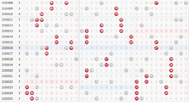 上图为双色球红球重号走势,作为双色球最热门的形态之一,红球重号近期异常火热,过去18期开奖中,17期都有重号现身,还有多枚号码至少连出3期,彩民选号需留意。而在周日晚红球23开出后,它已经成为2026年最长连出的红球号码,目前与30并列,均为连开4次,下期再开可独享纪录。