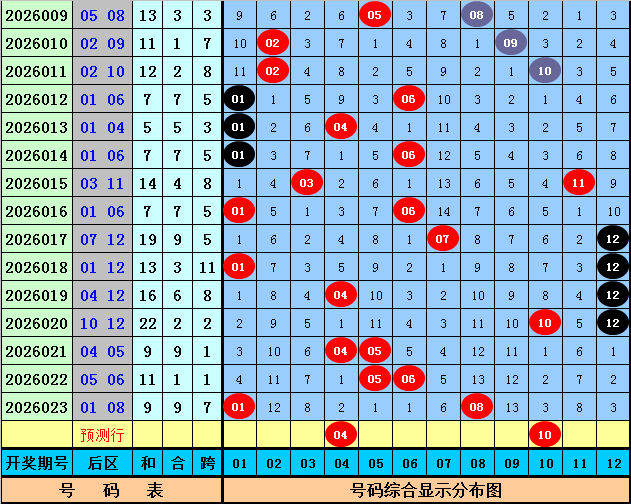 后区分析:上期后区开出号码01和08,最近10期后区奖号奇偶比为9:11,大小比为8:12,本期后区看好号码04、05、06、07、10,后区单挑两码04、10。