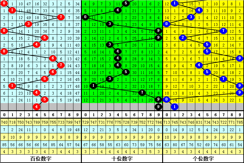 大中小分析:在组选0-9号码分布图中,前10期小 号(0-2区段)出现5枚奖号,中号(3-6区段)出现17枚奖号,大号(7-9区段)出现8枚奖号,上期大中小区间分别出现1枚奖号,本期预计大中小区域各出1枚奖号。