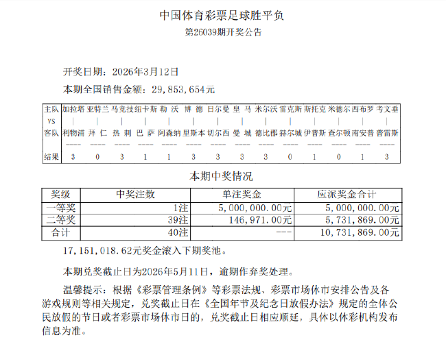 北京时间3月12日,足彩第26039期开奖结果揭晓。本期一等奖仅开1注,单注奖金500万元。二等奖开出39注,单注奖金146,971元,17,151,018.62元奖金滚入下期奖池。任九开出223注51,216元。本期胜负彩销量为29,853,654元,任九投注总额为17,845,734元。