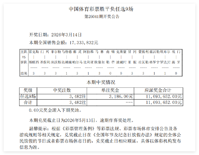 北京时间3月14日,任九第26041期开奖结果揭晓。任九开出3482注,单注奖金3186元。本期任九投注总额为17,333,832元。